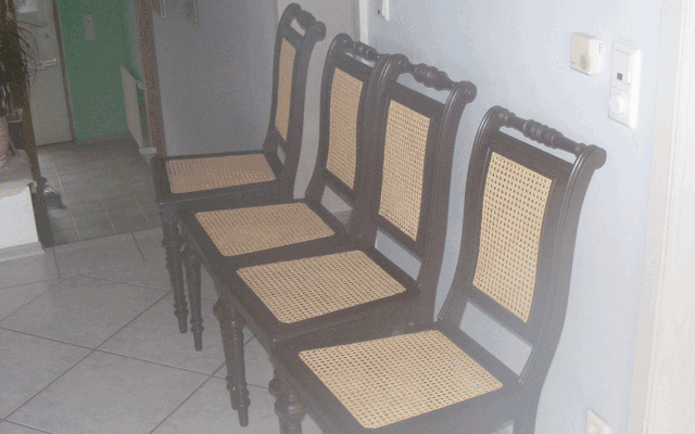 Blick auf die vier Stühle mit erneuerten Sitz und Rücken im Wabengeflecht.